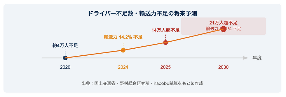 調査によると、2020年度のドライバー不足は約4万人でしたが、2025年度には14万人超、2030年度には21万人超に拡大すると予測されています。